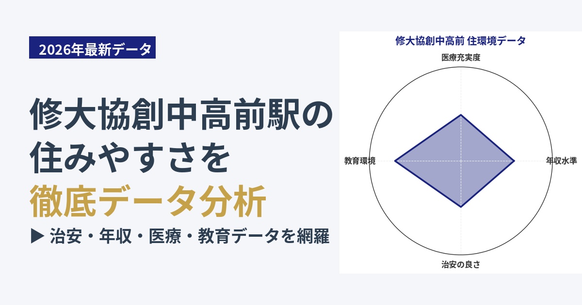 修大協創中高前エリアは、修道大学附属協創中学校・高等学校が立地していることから、学生が多く、活気のある雰囲気があります。日中は学生や地域住民の往来が多く、子育て世帯にとって比較的安心感のある環境と言えます。通学路は整備されており、子供たちが学校に通う上での安全性は一定程度確保されています。しかし、治安スコアが49点であることを踏まえると、過度な安心は禁物です。子供の夜間の外出や、人通りの少ない場所での行動には、保護者の注意と見守りが必要です。地域全体としては、子育て世帯が暮らしやすい要素を持ち合わせていますが、防犯意識を高く持つことが推奨されます。